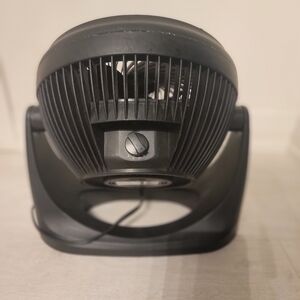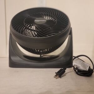 Compact black table fan by AmazonBasics. Ideal for cooling small spaces.
