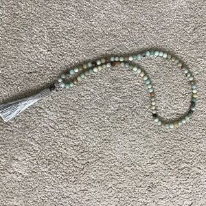 Amazonite Mala Necklace with silver tassel. Shades of green, brown, blue, cream