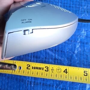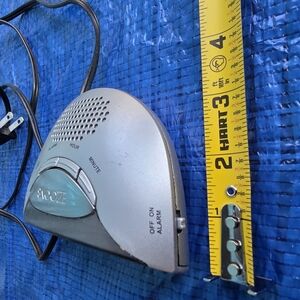 Sleek silver alarm clock with digital display. Features snooze button and AM/PM indicator.