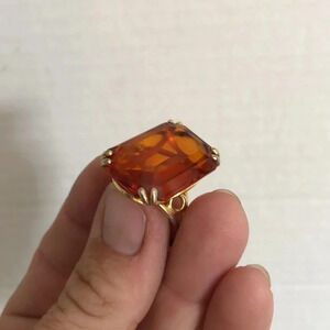 Amber portion is likely glass or something similar, not actually stone. The band is a goldtone and size is adjustable. Unmarked.
