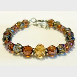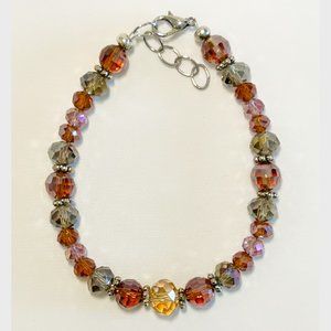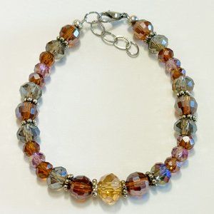 Made with 1 large golden amber, several medium and small dark amber, lavender, and grey glass faceted beads, with lobster claw clasp
