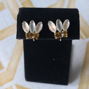 These are a delightful pair of Art Deco style screw back earrings. They have sparkling, amber colored rhinestones with three, striking opalescent drops. The earrings are in excellent condition. Please refer to measurement photo's for approx. size.