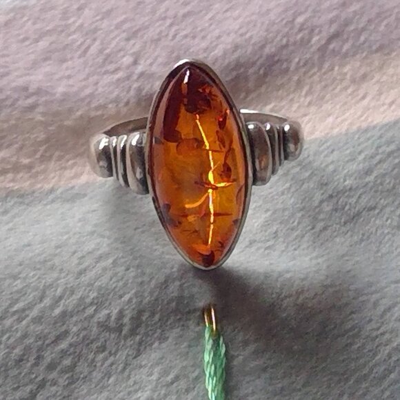 Warm and light filled amber ring! ^_^ This is a beautiful rich sienna hue amber stone, measuring almost 2 cm. It's an elongated almond shape. The amber stone is smooth and the silver tone metal has an effortless texture that is easy to wear. Have not tested for real silver. Pretty enough for everyday wear and could also be styled with your additional rings. No visible brand; size 8. Reasonable offers welcome!