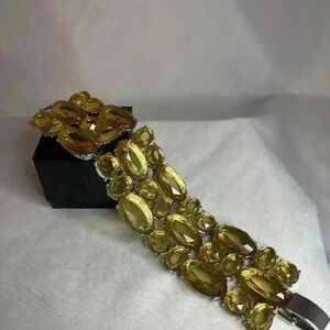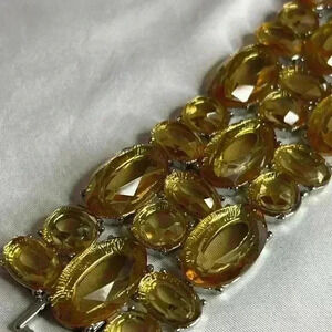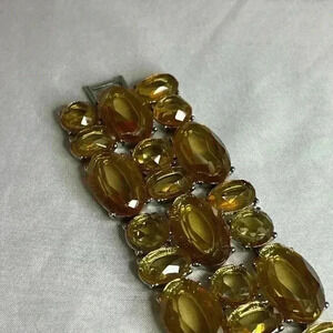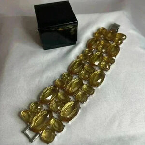 Amber coloured..costume bracelet.. under magnification there is very, very light wear to the top of the bracelet.. under normal light conditions, flawless..measures 7” long x 1.5” wide….hard amber coloured acrylic stone..