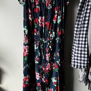 This unique piece blends the comfort of a romper with the elegance of a maxi dress. Featuring a navy blue base with bold floral print, it has built-in shorts underneath for ease and a flowy maxi skirt overlay that adds drama and movement with every step.