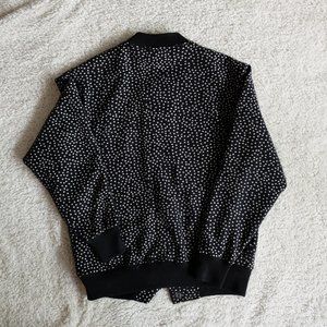 This is an XXS American Apparel black with a cute white polka dot jacket or even a sweater for those in-between seasons. It is button-up. Please note that the second button from the top, the material around the button is a "loose" and therefore some times harder to button up. I've tried to take a good photo of this, please review before purchasing.