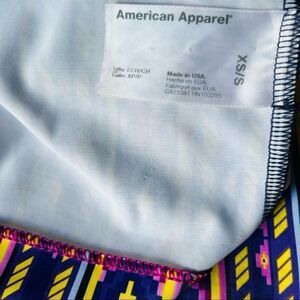 American Apparel bodycon dress with a mesh illusion neckline in size XS. Features vibrant geometric patterns reminiscent of Art Deco design for an eye-catching look.