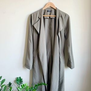 This beautiful light weight trench coat by American Apparel is perfect for Spring or Fall! It features a beautiful, sage green drapey fabric and a belt tie.