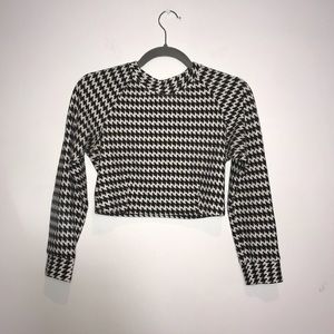 American Apparel Two Piece Set: Long Sleeve Crop Top & High Waisted Skirt in a black and white houndstooth pattern. Skirt has a 7" slit on one side.