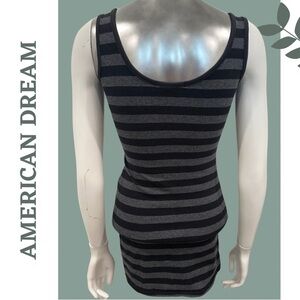 This American Dream striped tank dress is a stretchy, curve-hugging essential that can be styled solo or layered. Featuring classic gray and black horizontal stripes, a scoop neckline, and a mini length, this dress is perfect for warm weather, casual days, or as a layering piece under a jacket or cardigan. Super soft with plenty of stretch—comfy and flattering!