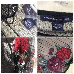 American Eagle AEO Sheer Mesh Flowers Embroidered Rose Stretch Top Shirt Y2K Dots