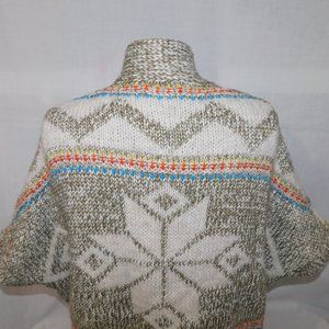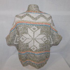 This Womens XS / S American Eagle Aztec South West Chunly Knit oversize Open Cardigan with Dolman Sleeve Open Front Cardigan Sweater is in great clean bright condition. Sweater is 69% Acrylic, 25% Wool and 2% Alpaca - Hand Wash - Lay flat to dry. Sweater is cream brown with accents of blue orange and yellow throughout.