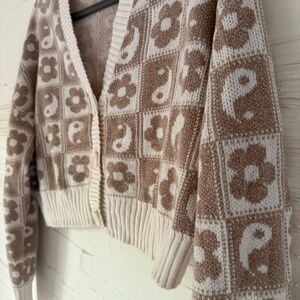 A cozy and playful cardigan with an allover smiley face and yin yang motif. The beige base makes it easy to style, while the quirky pattern adds fun to any outfit. Perfect for layering with jeans, leggings, or even over a dress for a casual-cool vibe.