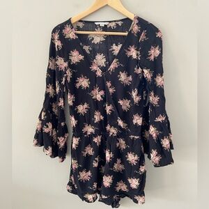 American Eagle Black with Pink Floral Print Summer Pocket Flare Sleeve Romper