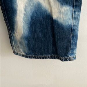 These American Eagle bootcut jeans feature a striking blue and white tie-dye pattern, offering a unique and stylish look. The medium blue denim is complemented by a faded, distressed wash, giving them a trendy, worn-in appearance. Perfect for adding a touch of flair to any casual outfit.