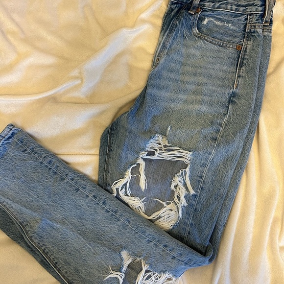 Stylish distressed blue jeans perfect for a casual look. Comfortable and trendy, these jeans are a must-have for your wardrobe.