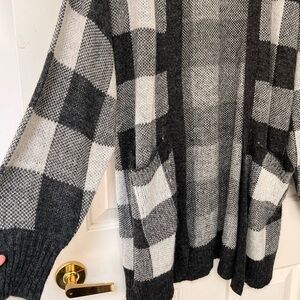Cozy and classic, this American Eagle buffalo plaid open-front cardigan is the perfect layering piece for chilly days. Features a black and white checkered knit with two front pockets, ribbed trim, and a slouchy relaxed fit. Mid-thigh length for great coverage.