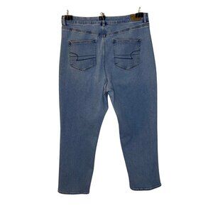 Step out in style with these American Eagle Curvy Mom Jeans! These trendy jeans, in a light wash, feature a high waist and a relaxed fit through the hips and thighs, tapering slightly towards the ankles for a flattering look. Made from stretchable fabric, they provide comfort and flexibility, perfect for any casual outing.
