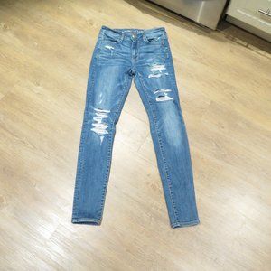 A very comfortable and cute pair of jeans from American Eagle. They have distressed details on the front, front pockets, back pockets and bottom cuffs. All intentional. Excellent used condition with no visible damage. The colour is more of a medium blue. Less saturated than on the model photo.