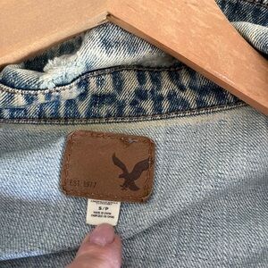 Stylish denim jacket with distressed details. Features a classic button-up front and chest pockets. Perfect for casual wear.