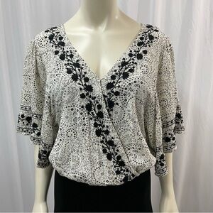 This adorable top is so fun and airy. The front crosses over like a wrap top but is fastened at the bottom which is loosely gathered with with an elastic waist band. There is a small thread and hook closure at the chest the keep the two layers fastened in place. The sleeves are belled and finish halfway down the arm. The design is a delicate embroidery of paisley and floral border.