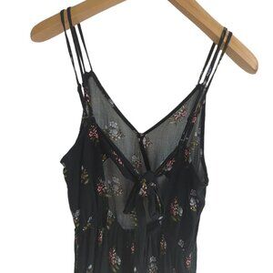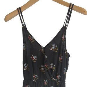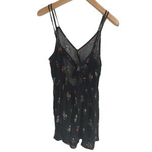 This is a black sleeveless romper with an allover floral print by American Eagle Outfitters. Made from a crinkly woven fabric.