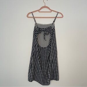 gingham dress, black and white mini dress, tie back dress, open back sundress, cottagecore style, american eagle outfitters, picnic dress, lightweight summer dress, cotton linen blend, adjustable straps, square neckline dress, retro vibe, breezy outfit, gemini core, casual flirty look, cute weekend wear, trendy gingham print, warm weather style, comfy and cute, statement back detail