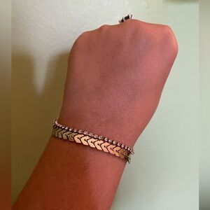 This exquisite bracelet from American Eagle Outfitters showcases a beautiful blend of gold and silver tones, crafted in a sophisticated braided design. Its slim, bangle-style profile wraps elegantly around the wrist, making it a versatile accessory for any occasion. The intricate metalwork catches the light, highlighting the detailed craftsmanship and adding a touch of elegance to your ensemble.