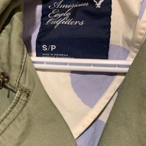 VGUC American Eagle Outfitters green belted trench coat with epaulettes in women’s size small.