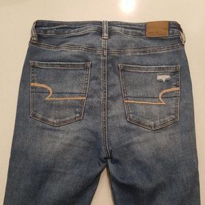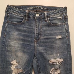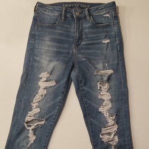 American Eagle Ne(x)t Level Stretch denim. Skinny jeans with a high waist, zip fly, and distressed rips on legs. Raw hem at ankles.