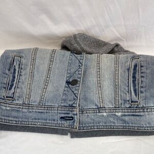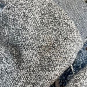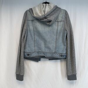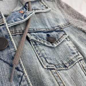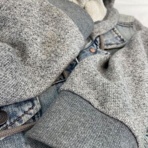Light wash distressed denim core with sweater arms and hood