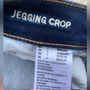 Comfy and stylish American Eagle Outfitters Jegging Crop jeans in a dark wash. Made with Super Stretch fabric for the perfect fit! These jeans are size 2 Regular and have a flattering cropped length—perfect for casual wear or dressing up.
