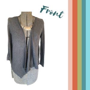 This is a beautiful and versatile gray cardigan. It has an intricate lace back.