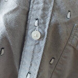 This previously owned button down casual shirt is in good used condition and features and all over pattern of tiny penguins. Part of the seriously soft collection makes this shirt comfy and cozy to wear.