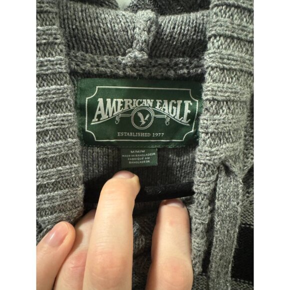 American Eagle Men's Medium Gray Striped Hooded Knit Sweater Pullover