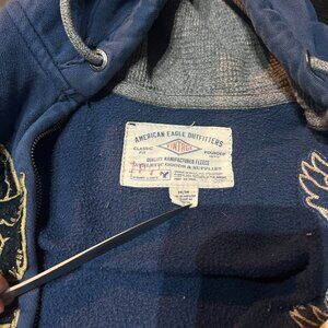 american eagle hoodie, vintage fleece hoodie, mens spell out hoodie, blue zip hoodie, cozy fleece, soft hoodie, streetwear basics, casual menswear, everyday hoodie, AE vintage