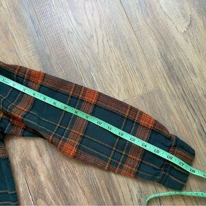 Stylish plaid cropped shirt with button-up front. Features vibrant orange and green colours. Perfect addition to any fall outfit. Can also be worn as a light shacket.