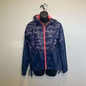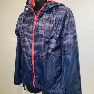 American Eagle outfitters, blue camo and pink print windbreaker jacket. Size small. Zip up, two front pockets, inside pockets, adjustable bottom by pull strings. In good used condition.