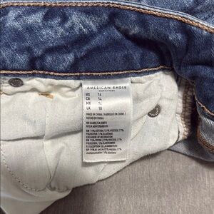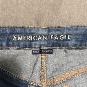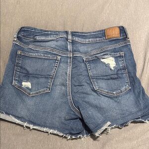These American Eagle Outfitters jean shorts feature a stylish distressed design with a medium-to-light blue wash. The cut-off style hem and frayed edges add a trendy touch, making them perfect for a laid-back, casual look.