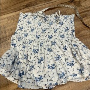 Chic tank top with blue floral pattern. Features button-down front and smocked design. Perfect for casual wear.