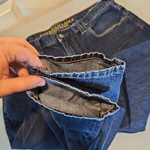 These blue slim jeans from American Eagle Outfitters feature a sleek silhouette with a deep indigo wash, offering a modern and versatile look. Crafted for comfort and style, they are ideal for both casual and semi-formal occasions. The high-quality denim ensures durability and long-lasting wear. Using hand measurments in listing for accuracy of fit.