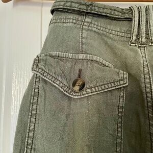 These olive green cargo pants from American Eagle Outfitters are a size four and are made of linen and viscose material. They're a bit more flowy, have less structure, and are lighter than the traditional cargo pant. The pants are in good condition - the only thing is that the tag at the back has been ripped off. They have two very large pockets on the front, two large button-up pockets on the bum, and a removable tie belt. The pants are done up by a zipper and two buttons and the fit is straight leg down to the ankle.