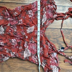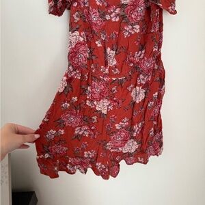 Vibrant red with floral pattern. Sleeveless design. Perfect for casual outings.