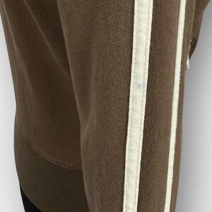 Brown American Eagle Outfitters track jacket with white contrast stripes down the sleeves, a stand collar, and full front zip closure. Features two front zip pockets, ribbed cuffs and hem, and raglan long sleeves. Good pre-owned condition with light overall wear and a small stain as shown