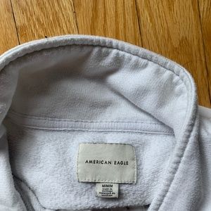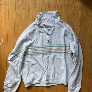 Cozy white sweater with buttoned collar. Features pastel stripe accents.