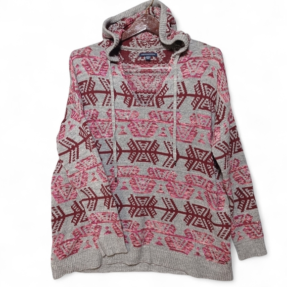 Add a cozy, cabin-inspired layer to your wardrobe with this American Eagle knit hoodie in a beautiful Southwest-influenced pattern. Made from 100% cotton, this sweater is soft, breathable, and perfect for everyday comfort. It features a relaxed hood, a deep V-neckline, and a gorgeous mix of grey, burgundy, and pink woven geometric designs. A great choice for casual wear, layering, or cool-weather outfits.