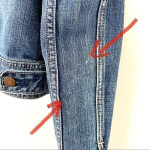 This jacket has a bit of distressing here and there. Also a small tear around the elbow of one sleeve. It just blends in with the rest of the distressing. See last pic with arrows.