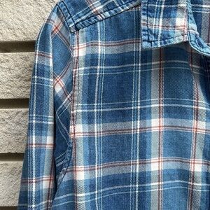 American Eagle Boyfriend fit plaid button down shirt. Blue, white with a small burgundy stripe. 100% cotton that's nice and soft, feels exactly like the perfect Boyfriend fit shirt should - soft and comfortable, loose through body for a relaxed fit.