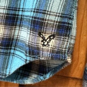 American Eagle Plaid Button Down Shirt Turquoise Blue Black 100% Cotton - XS