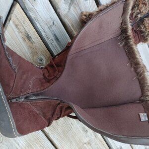 Warm weather boots with faux fur cuff and pom pom accents.